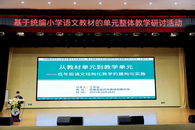 近日,宿州市教育体育局小学语文教研员、安徽省首批新时代名师丁长征老师,作为全国仅有的五位代表之一,在中国教育学会小语专委会主办的“基于统编小学语文教材的单元整体教学研讨活动”中作大会论文交流,其研究成果受到北师大易进教授、全国小语专委会副理事长柯孔标教授等专家的高度评价,展现了我市“双名工程”在高层次教育人才培养方面的扎实成效。