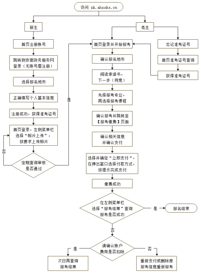 报名网址为https://zk.ahzsks.cn/。系统限定每位考生在报名期间只能报考一次(最多选报四门课程),考生若报考多个专业内课程也必须一次性完成。报名采用网上缴费,缴费截止时间:3月6日19:00(报名期间每日23:00至次日1:00是银行对账时间,请勿在此时段缴费)。考生缴费成功后,无法撤销或退费,也无法进行补报、改报。报名网站不提供教材征订服务,考生可根据安徽省教育招生考试院公布的教材版本自行购买。