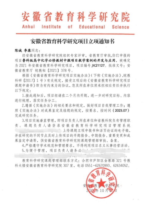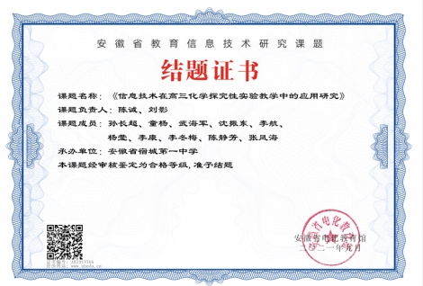 陈诚名师工作室以教研活动为纽带,通过开展课题研究,着力培养优秀青年教师,助力教师专业成长。2021年9月,在安徽省电化教育课题《信息技术在高三化学探究性实验教学中的应用研究》顺利结题后,工作室成员再接再厉,又顺利立项安徽省教育科学研究课题《鲁科版高中化学必修教材中微项目教学案例的开发与应用》。通过相关课题研究,工作室成员在中文核心期刊《化学教学》《化学教育》及各类省级以上学术期刊陆续发表相关研究成果论文11篇,4篇项目式教学课例顺利入选安徽省教科院资源征集活动。