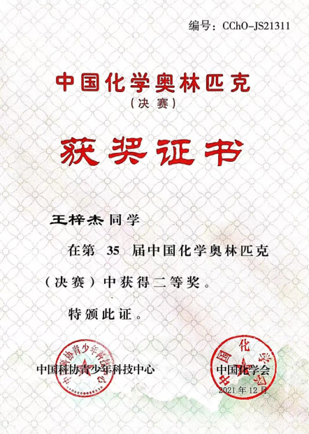 陈诚名师工作室着力培养学科特长生,强化竞赛教练员队伍建设和竞赛课程管理,形成了较成熟的特长生培养模式。在竞赛辅导周期,工作室组建了教练员团队,实行了主教练负责制,科学规划辅导内容,全程跟踪重点指导。2021年12月,第35届全国高中生化学奥林匹克竞赛落下帷幕,陈诚名师工作室辅导学生获省一等奖5人,省二等奖11人,特别是名师工作室主持人陈诚老师辅导的王梓杰同学不负众望,以省赛第四名的优异成绩入选安徽省队,并在全国比赛中斩获银牌。作为安徽省优秀奥赛教练员,这也是陈诚老师辅导学生获得的第二枚全国银牌。