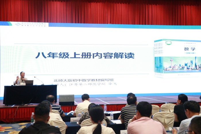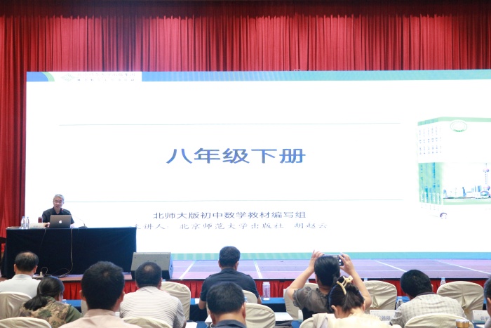 培训环节,多位专家围绕北师大版新修订教材展开深度解读与实践指导。江苏第二师范学院教授、北师大版初中数学教材副主编章飞,正高级教师、浙江省特级教师、北师大版初中数学教材编写组核心成员胡赵云,分别就《北师大版八年级数学上、下册新修订教材》进行解读。两位专家立足教材编写视角,系统阐释了教材内容增删调整的逻辑、同一知识不同呈现方式的时代背景与理论依据,为教师理解教材编写理念提供了核心思路。
