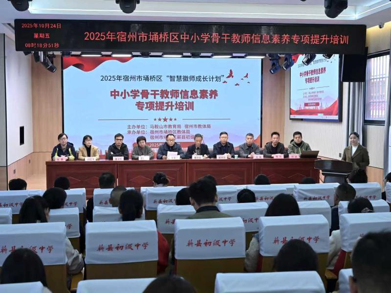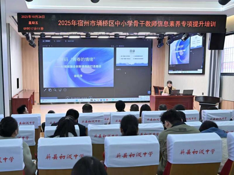 10月24日,2025年宿州市埇桥区“智慧徽师成长计划”中小学骨干教师信息素养专项提升培训在蕲县初级中学报告厅举行。本次培训由马鞍山市教育局与宿州市教体局联合主办,埇桥区教体局、蕲县初级中学共同承办。活动采用“线下+线上”融合模式,全区各校学科骨干教师同步参与,共享智慧教育前沿理念与实践成果。