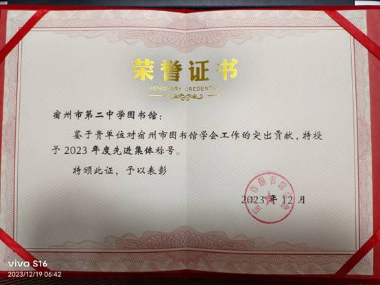 宿州二中图书馆荣获2023年度市图学会先进集体称号