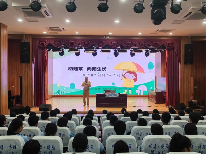 随后,湖州市教育科学研究中心心理健康教研员、国家二级心理咨询师王悦老师,以“从‘身’动到‘心’动”为主题,带来了一场兼具专业性与实用性的心理辅导讲座。讲座中,王悦老师打破传统理论讲授模式,通过现场互动体验,手把手指导学生进行按压胆经、刺激百会穴等身体放松练习,并重点讲解睡眠修复与情绪调节的重要性。针对考试焦虑这一常见问题,他特别推荐了“478呼吸法”与音乐放松法等实用技巧,并倡导学生将运动融入日常,通过规律锻炼释放压力、提升心理韧性,培养终身锻炼的良好习惯。