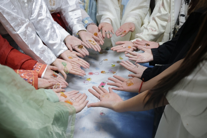 月饼DIY现场,社团成员耐心指导,同学们洗净双手,揉面团、包馅料、压模具,将对中秋的期盼与对家人的思念揉进每一块香甜的月饼中;团扇制作区里,素白扇面铺开,同学们手持画笔,或绘中秋明月、或画花鸟草木、或题经典诗句,一笔一划间,将创意与雅致融入扇面,打造出独一无二的中秋纪念团扇;一旁的手作香囊摊位更是清香四溢,艾草、丁香、薄荷等各式香料整齐摆放,同学们巧手翻飞,穿针引线,将清新香气与美好祝愿装进香囊。