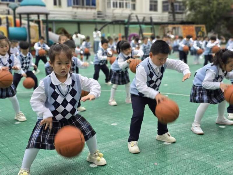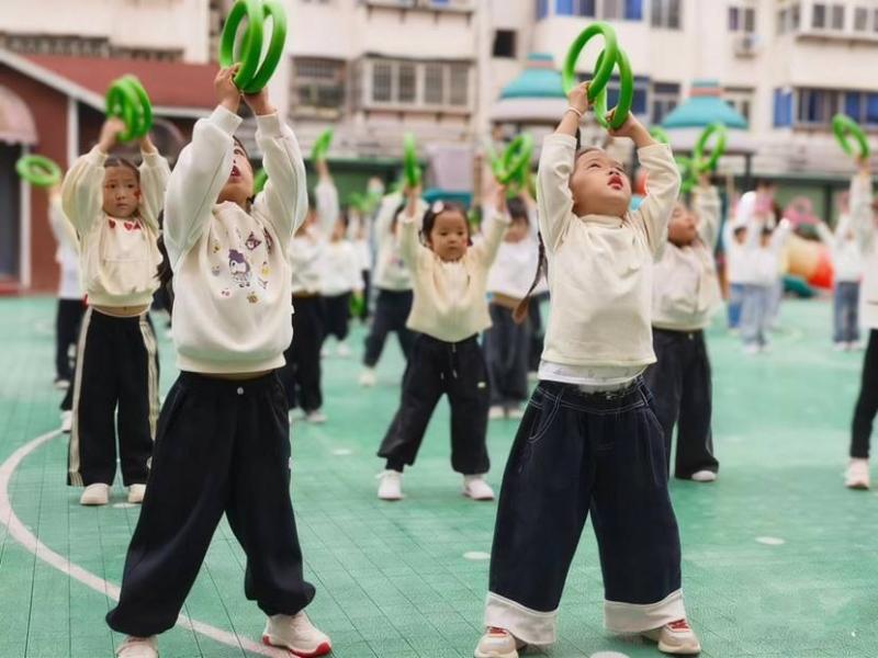 大班幼儿率先登场。他们的早操编排巧妙融合了器械操、篮球基本动作以及跳绳等多种元素。整套操富有趣味性和挑战性,充分体现了大班幼儿动作发展的成熟与自信飞扬的个性。